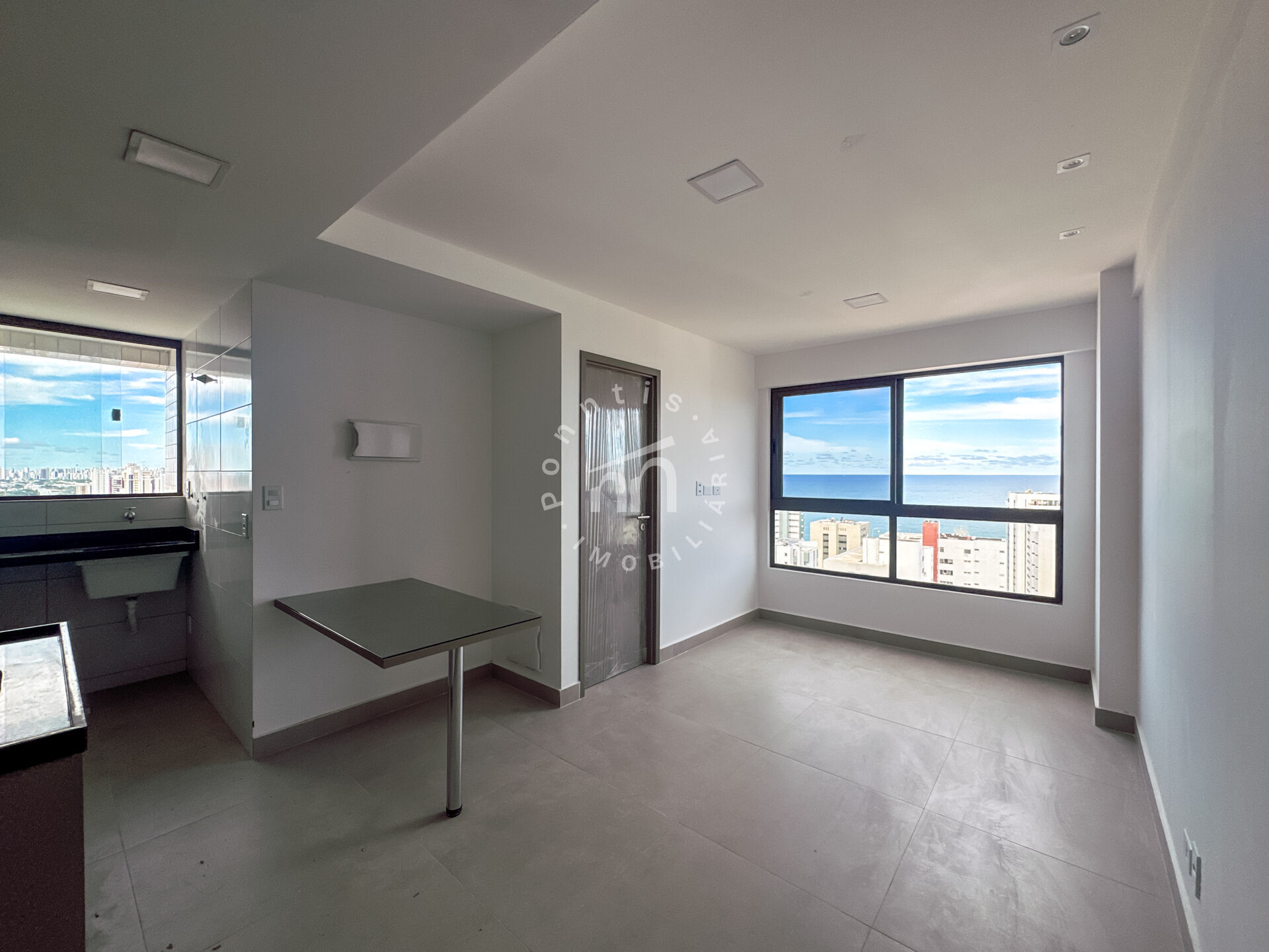 Apartamento compacto, com móveis planejados, andar alto e vista para o mar, em edifício recém construído, com área de lazer.